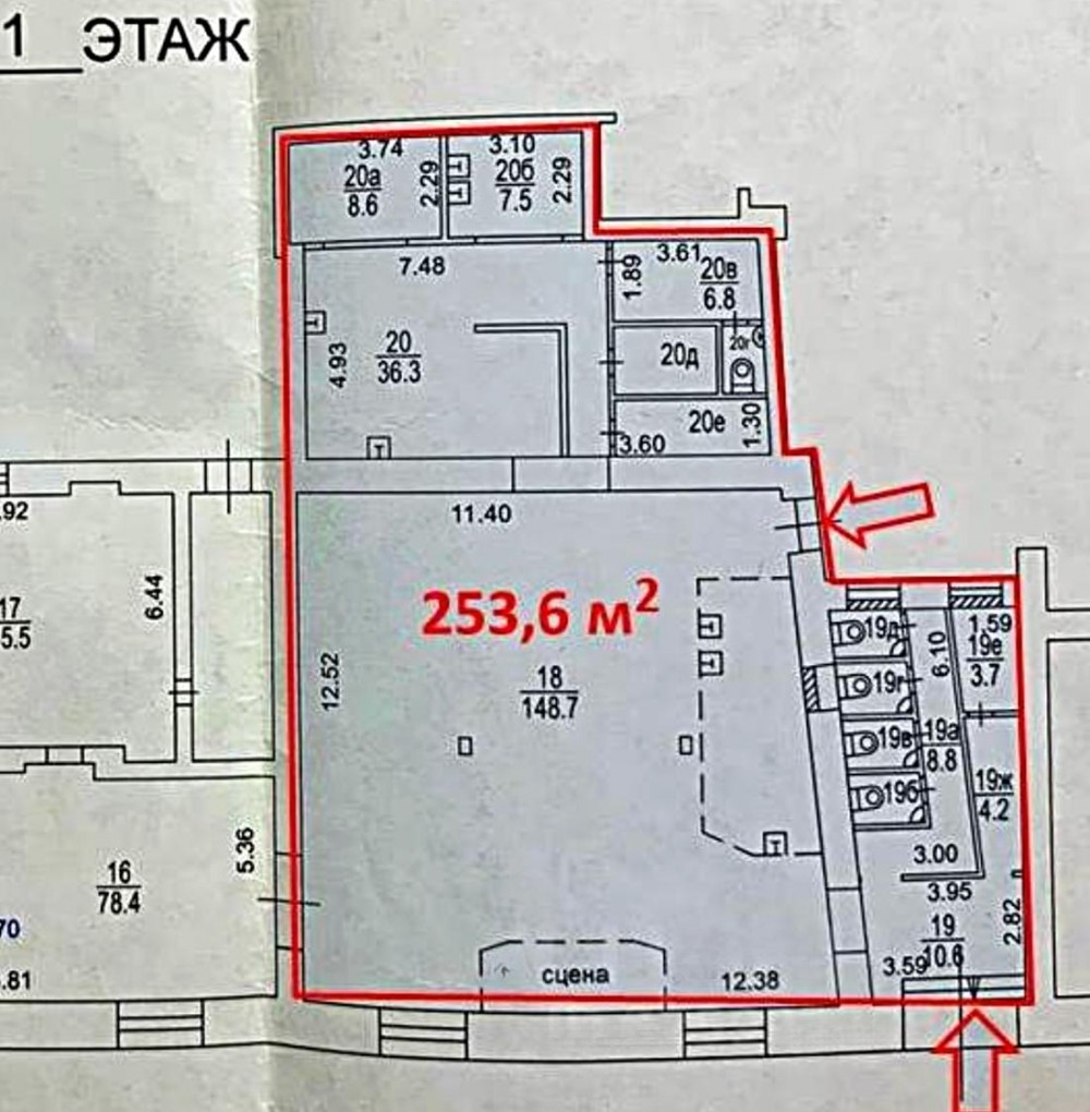 Первый этаж 253,6м2 с потолками до 3,7м. Две независимых входных группы. Ремонт за выездом арендатора. Установлена технологическая вытяжка, выделенная мощность 90квт.