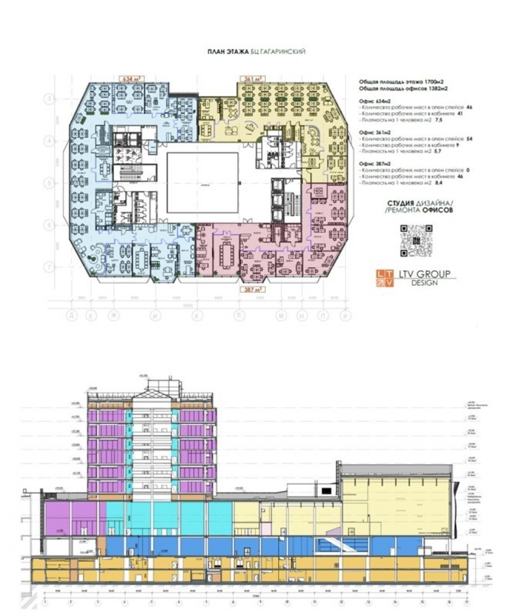 Атриум со стеклянной крышей добавляет помещению света и "воздуха". Панорамное остекление фасада (с фрамугами с электроприводом). Зона лобби 260 кв.м. (отдельный вход с улицы в офисную часть). Подземный теплый паркинг – 400 машиномест. Подземный паркинг КДЦ Гагаринский – 2500 машиномест БЕСПЛАТНО.
