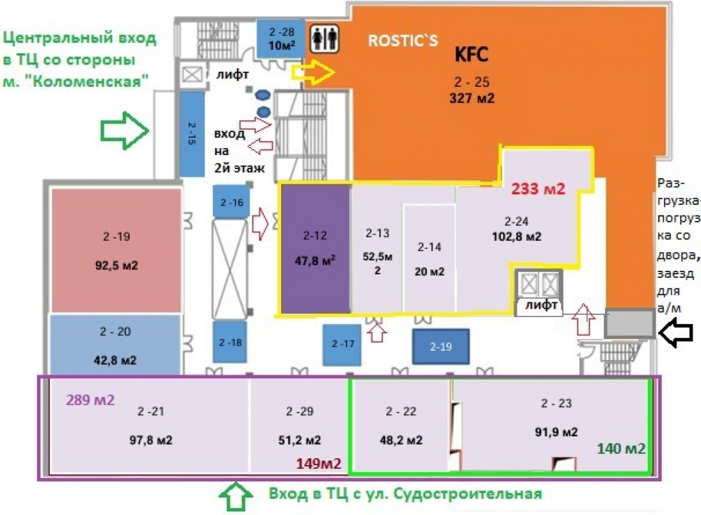 Аренда торгового помещения на 2 этаже в ТЦ "Коломенский", помещение справа от входа в супермаркет "Мираторг". Помещение имеет зальную планировку и отдельных вход с торговой галереи. Рекламная вывеска над входом в помещение для арендатора. График работы с 10.00-22.00. Есть зона разгрузки-погрузки. Состояние помещения хорошее, готово к въезду арендатора. Здание ТЦ находится в прямой видимости при выходе из метро "Коломенская".