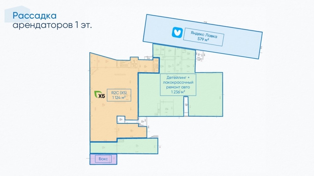 Арендаторы - "Яндекс Лавка" 579 м2, R2C Tech (Холдинг Х5) 1 124 м2, Детейлинг + лакокрасочный ремонт авто 1 236 м2, Бокс.