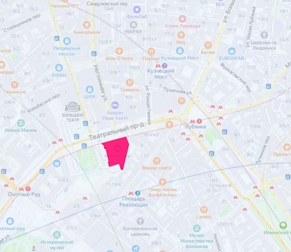 Напротив Большого и Малого театров. Рядом главные торговые улицы Москвы: Столешников переулок, Большая Дмитровка, Третьяковский проезд.