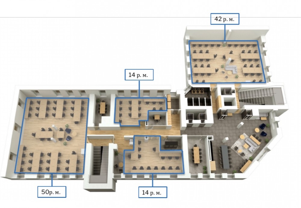 Офис расположен на 2-м этаже (здание с лифтом), представляет собой 2 блока open-space по 14 рабочих места каждое, в зонах общего пользования есть 3 переговорных и 2 телефонных будки, своя кухня и с/у. Качественный офисный ремонт. Офис полностью укомплектован.