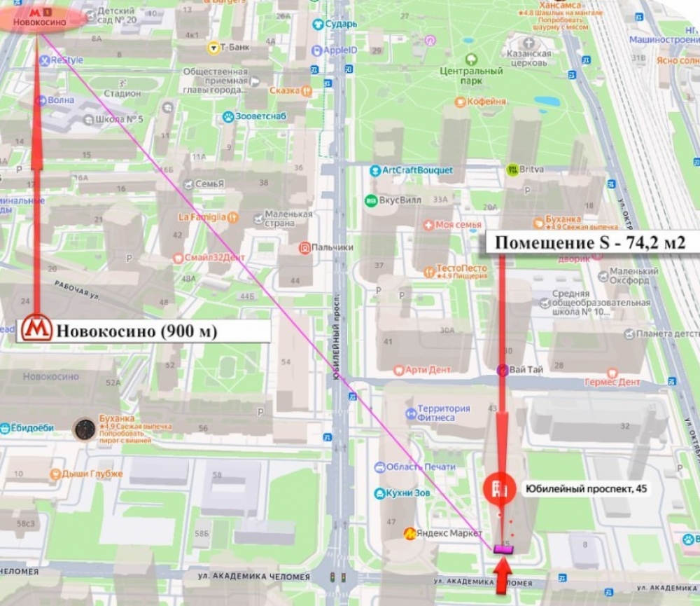 Транспортная доступность: до станции метро «Новокосино» — 17 минут пешком, до станции «Реутов» (МЦД-4) — 20 минут пешком, до центра Москвы — 20 минут на метро, есть удобный выезд на МКАД.
