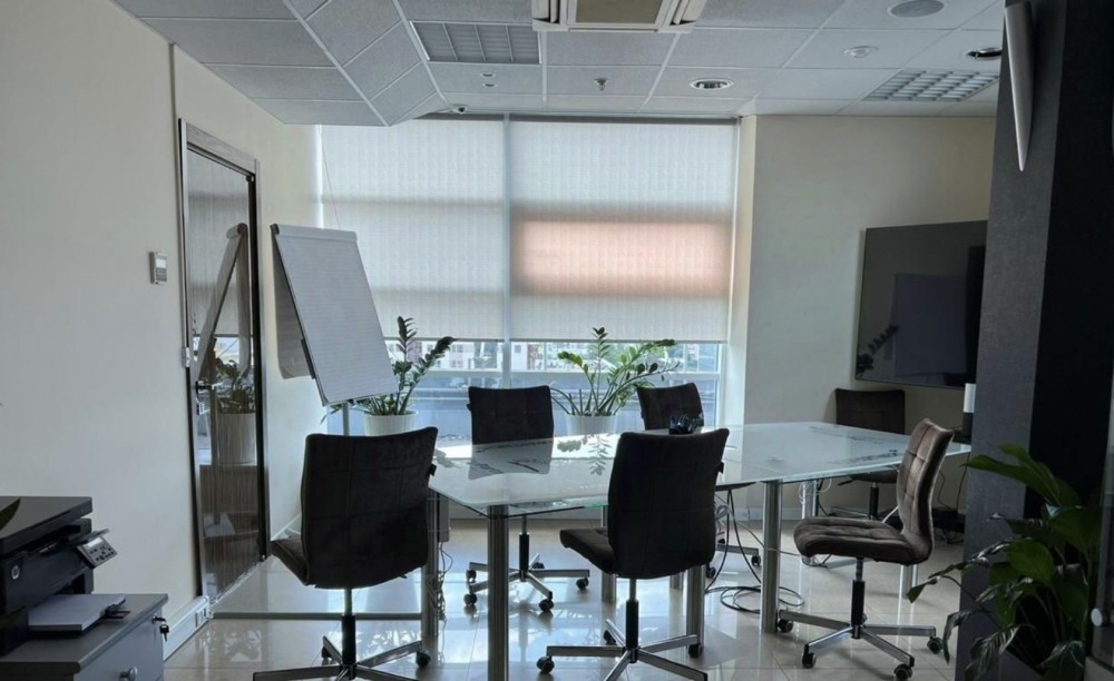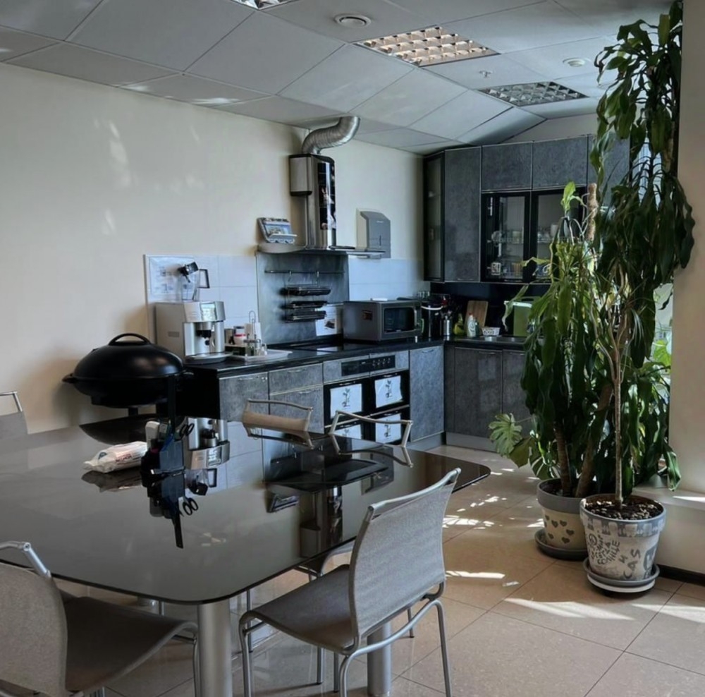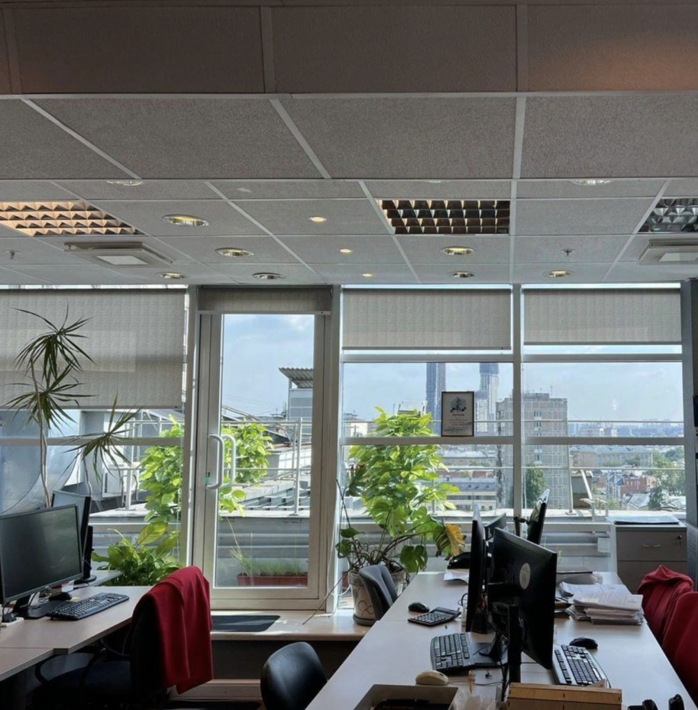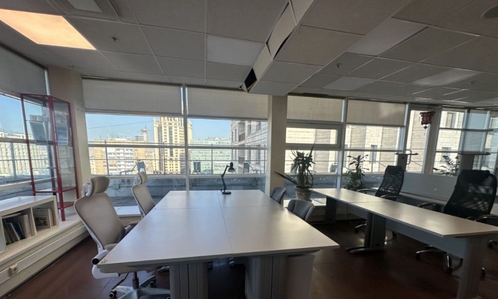 Офис расположен на 9-м этаже, панорамное остекление, смешанная планировка, своя терраса 100м2, кухня и с/у. Стандартный офисный ремонт.