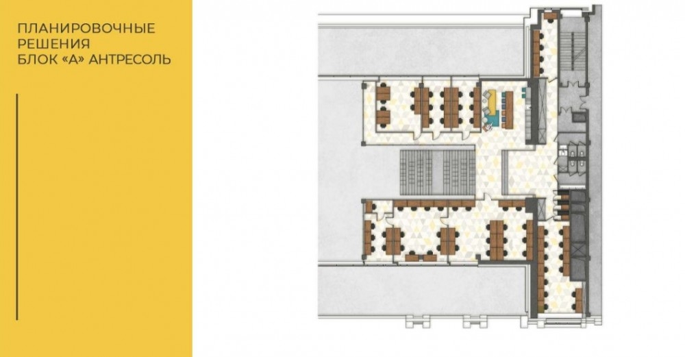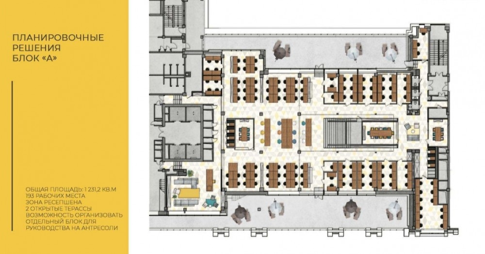 Блок "А" общая площадь 1 231.2 м2. 193 рабочих места, зона ресепшена, 2 открытые террасы, возможность организовать отдельный бок для руководства на антресоли