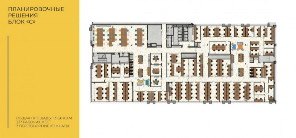 Блок "С" общая площадь 1 315.6 м2. 237 рабочих места. 3 переговорные комнаты.