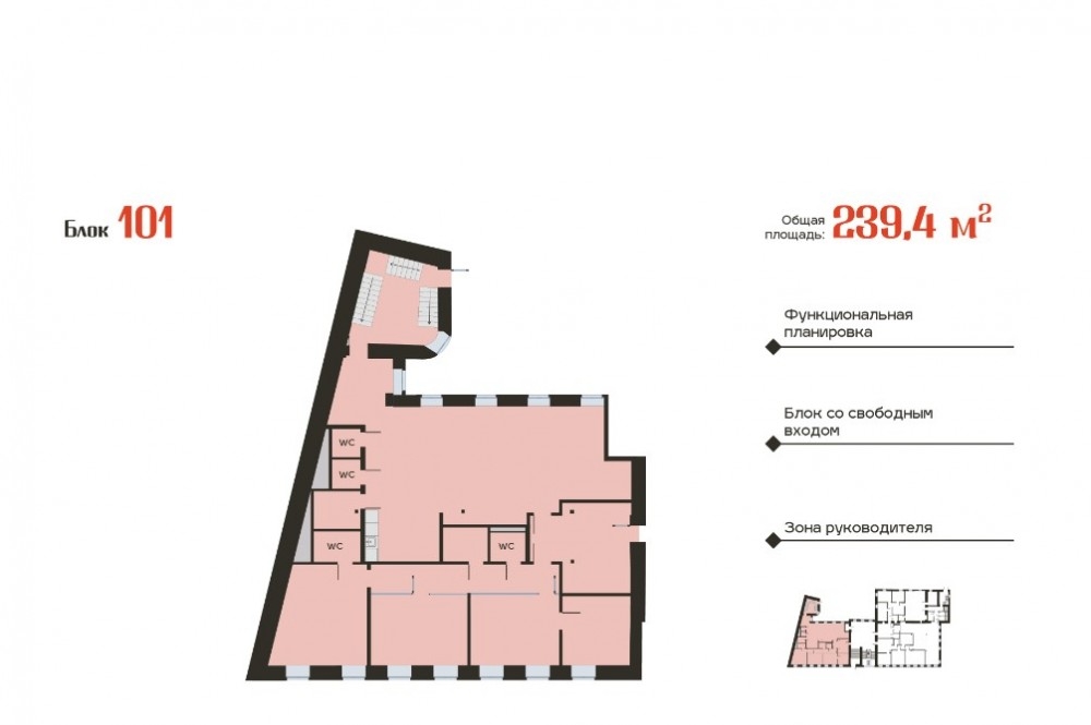 Зона руководителя. 2 кухонных зоны, 4 санузла.