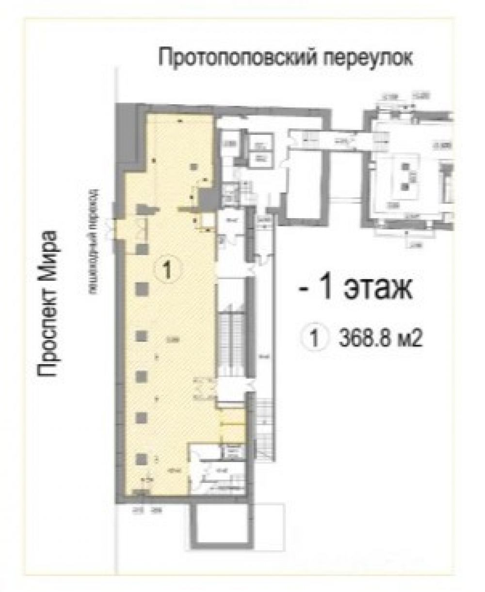 Продажа торговое на -1 этаже Торгово-административного комплекса Garden Mir. Помещение с арендатором. Вход через главный вход 1-я линия Проспекта Мира и из подземного пешеходного перехода. Помещение имеет отдельную входную группу из подземного пешеходного перехода от станции метро Проспект Мира (кольцевая) в сторону СК Олимпийского. Также, в помещение можно пройти через центральный вход в здание со стороны Проспекта Мира, спустившись вниз по эскалатору. Выполнена отделка. Здание в 2015 году прошло полную реставрацию фасада, модернизацию инфраструктуры и было запущено в эксплуатацию. Очень высокий пешеходный трафик. Разгрузка со двора (отдельный грузовой лифт). Мокрая точка имеется, вентиляция и отопление центральное.