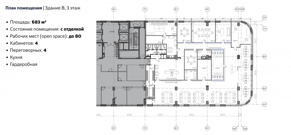 Общая площадь 683м2, смешанная планировка (4 кабинета, open-space, 4 переговорных, гардеробная, кухня, санузел), ремонт за выездом арендатора. В здании приточно-вытяжная вентиляция, центральное кондиционирование.