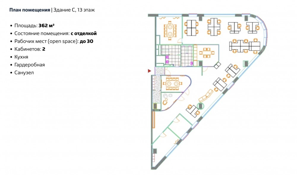 Общая площадь 903м2, смешанная планировка (2 кабинета, open-space, гардеробная, кухня, санузел), ремонт за выездом арендатора. В здании приточно-вытяжная вентиляция, центральное кондиционирование.