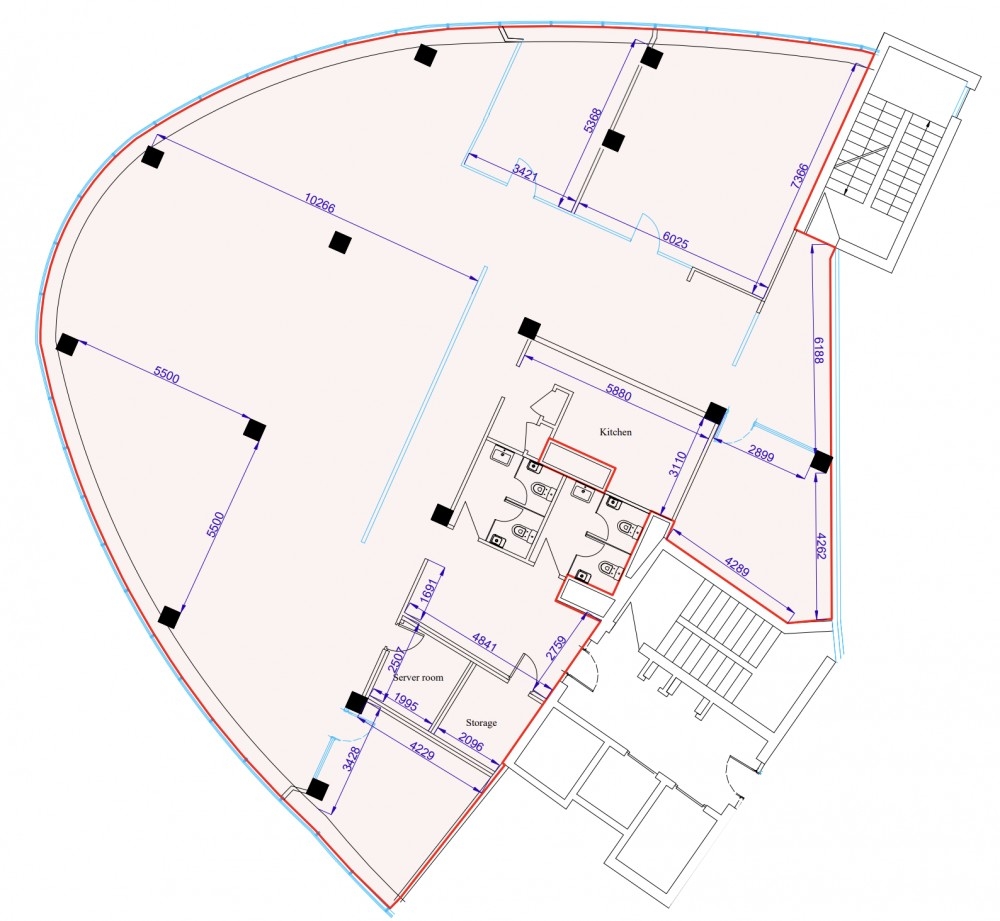 Офисный блок располагается на 5-м этаже, ремонт за выездом арендатора. Своя зона кухни и с/у. В здании приточно-вытяжная вентиляция, кондиционирование, высокие потолки.