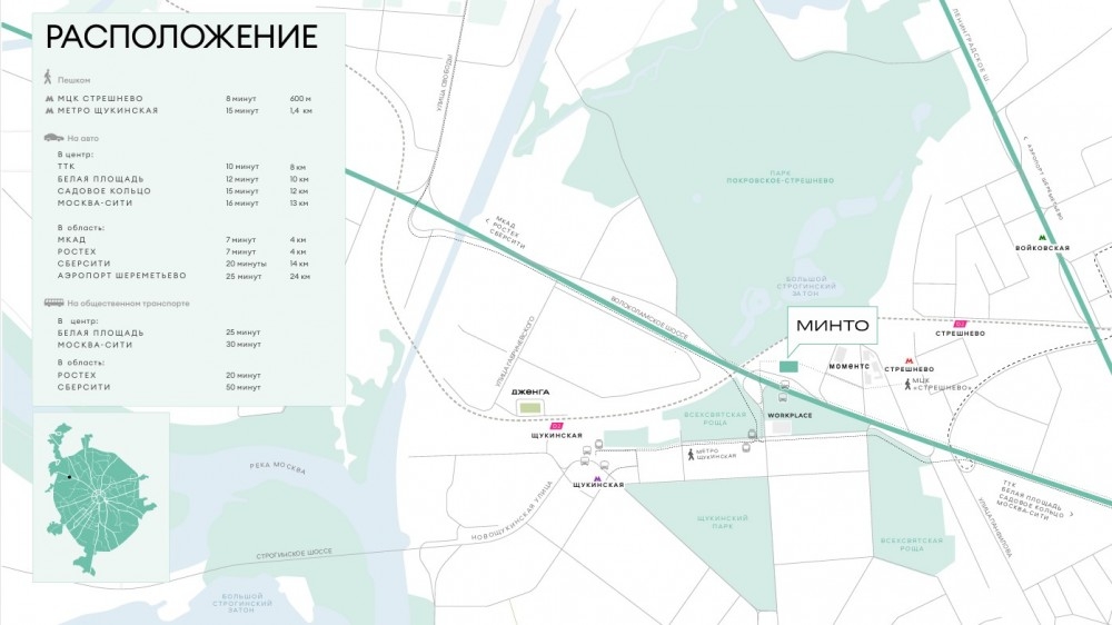 от станции МЦК «Стрешнево». Проект расположен в перспективной деловой локации, объединяющей современную инфраструктуру и близость к природе.