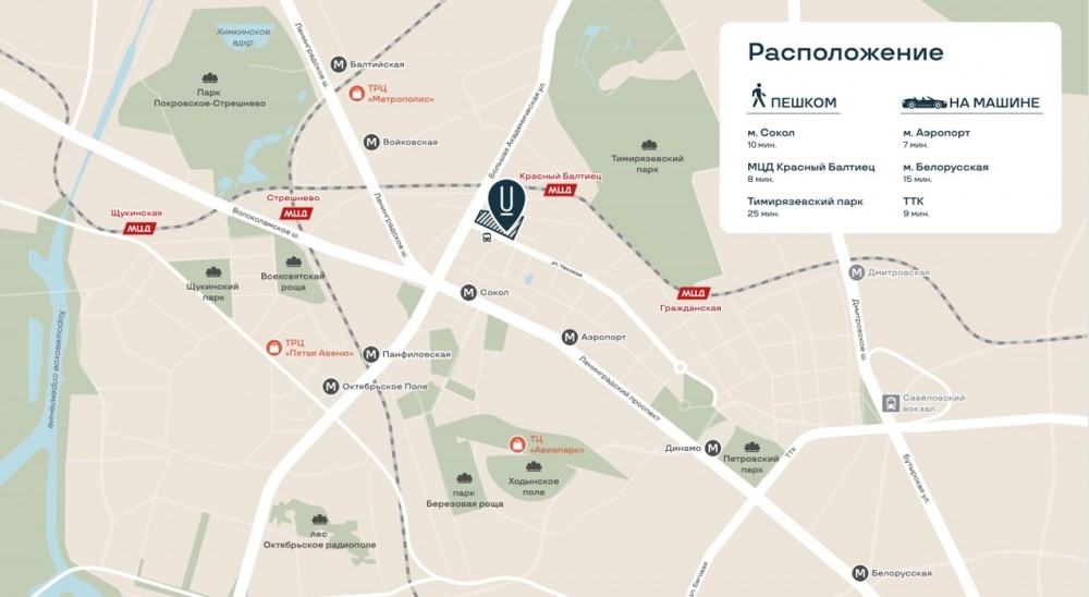 Транспортная доступность: в 10 минутах ходьбы от ЖК находится станция метро «Сокол», а в 10 минутах — станция МЦД-2 «Красный Балтиец». На автомобиле до Кремля можно добраться за 32 минуты, до международного аэропорта Шереметьево — за 38 минут.