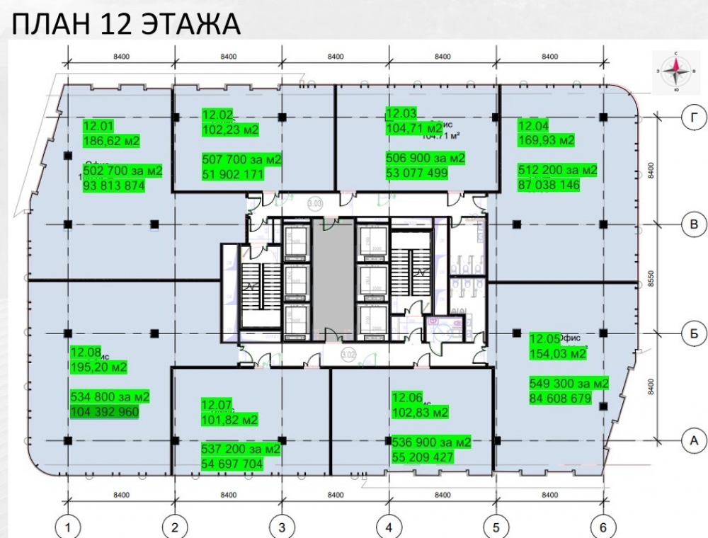 6 скоростных лифтов, шаг колонн 8.4 х 8.4, панорамное остекление, выделенная мощность офисов - 80 Вт/М2.