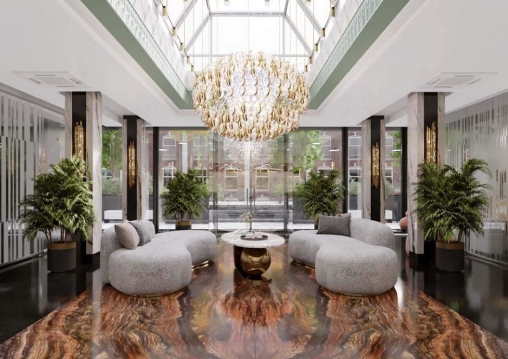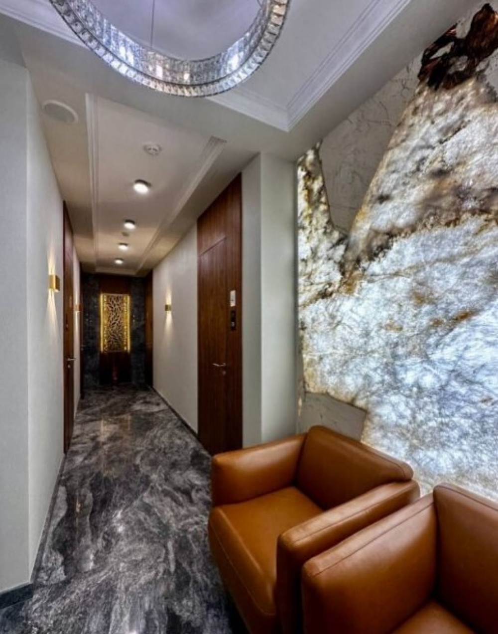 Представительское лобби и ресепшен. Премиальная отделка оникс, хрусталь, кожа.
