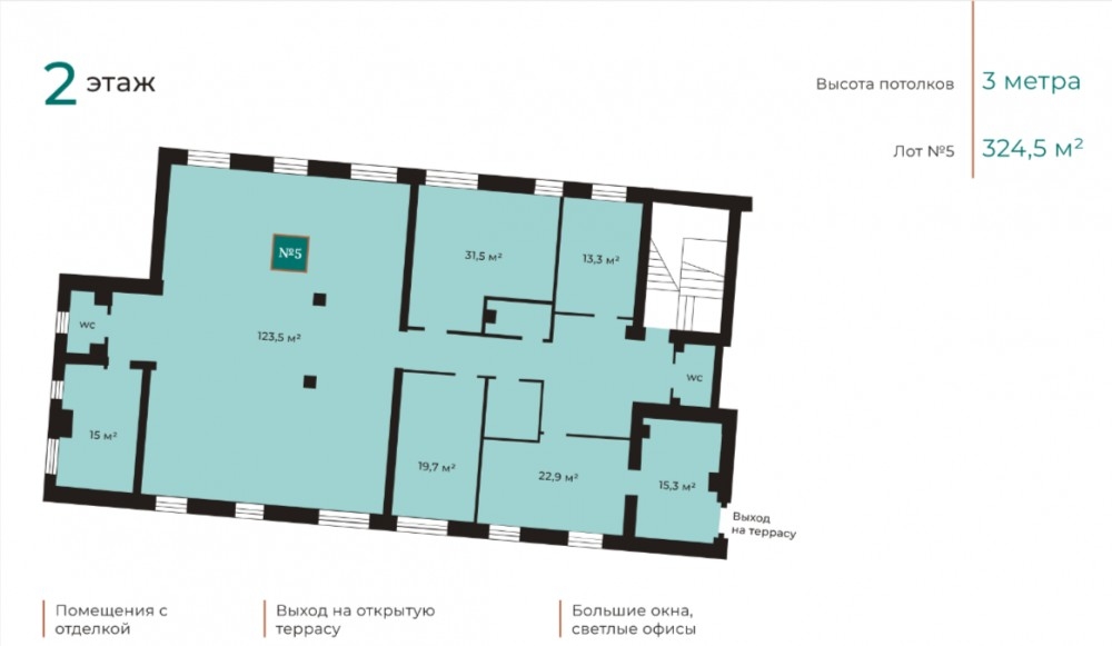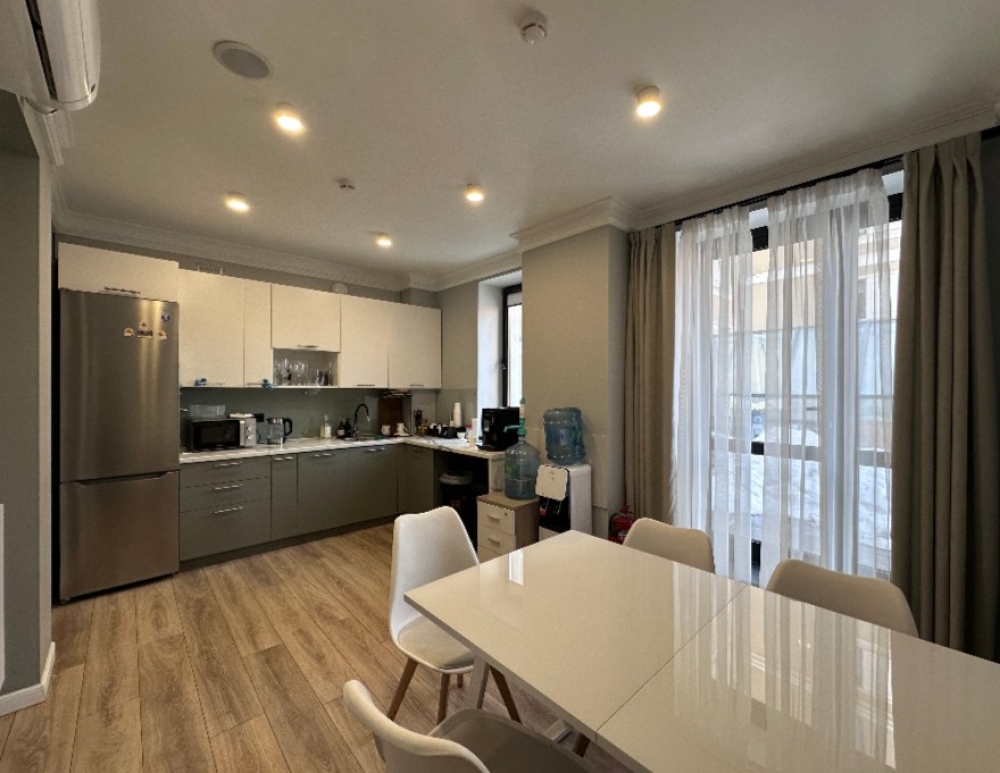 - Планировка смешанная: собственный ресепшн, переговорная, кабинет руководителя, 6 кабинетов, 1 open space, кухня, 2 санузла.
