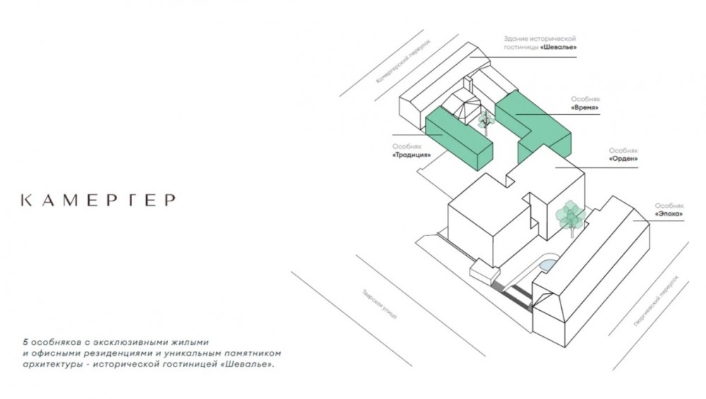 «Камергер» – новый комплекс особняков в 300 метрах от Кремля в самом центре Москвы. Комплекс включает в себя несколько особняков: жилые особняки с резиденциями класса deluxe, офисные резиденции и гостиницу «Шевалье» — бережно отреставрированный объект культурного наследия. Уникальный облик каждого здания дополняет общее впечатление от комплекса, который позволяет одновременно ощутить причастность к многовековому наследию Москвы и новейшим тенденциям мировой архитектуры.