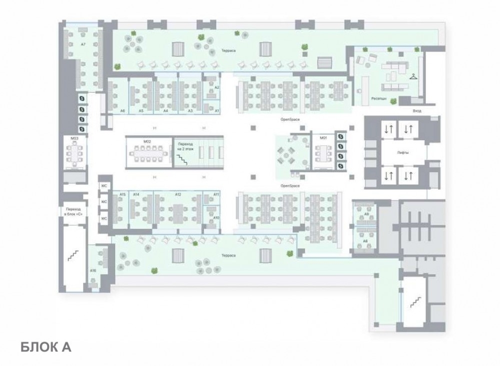 Блок "А" общая площадь 1 231.2 м2. 130 рабочих мест в кабинетах, 55 рабочих мест в общей зоне, переговорные, мягкие зоны для отдыха и общения, кухня со встроенной техникой, телефонные кабинки, готовая серверная.