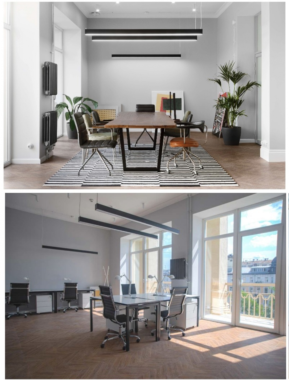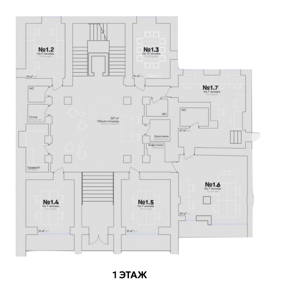 Офис рассчитан на 5 рабочих мест (блок 1.7 на плане). Открытая планировка, дизайнерский ремонт и мебель. В здании приточно-вытяжная вентиляция и кондиционирование.
